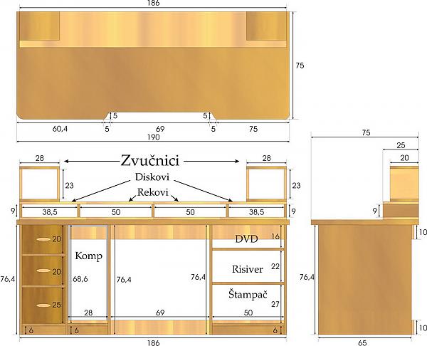Dimenzije ovog stola su malo čudne.... vrrlo je nizak... tako da ćemo mi malo povisiti ove djelove za rack... stol malo produljiti i dodati ladicu za klavijaturu. Samo da nam se sve poslo?i u glavi jer ću opet ostati bez stola.... :rolleyes: |