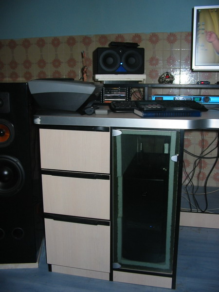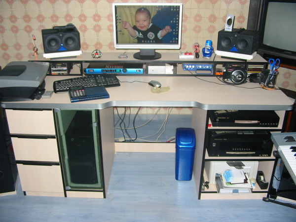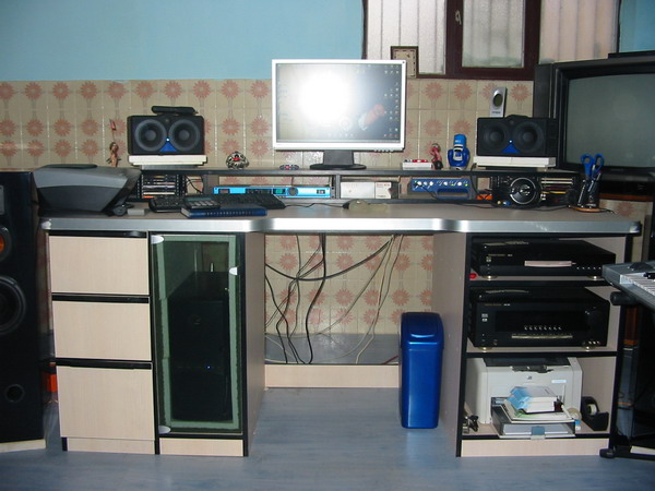 Attachment 2478 Attachment 2479 Attachment 2480 Ne vidi se ali su cijelim bocnim stranama napravljene pregrade za smjestanje diskova, kao i sa prednje lijeve strane... Dvije ploce oko mixera su napravljenje tako ta idu ka dolje, odnosno na blizem dijelu su 8cm od donje ploce stola, a na daljem dijelu(ka monitorima) su 12 cm. |