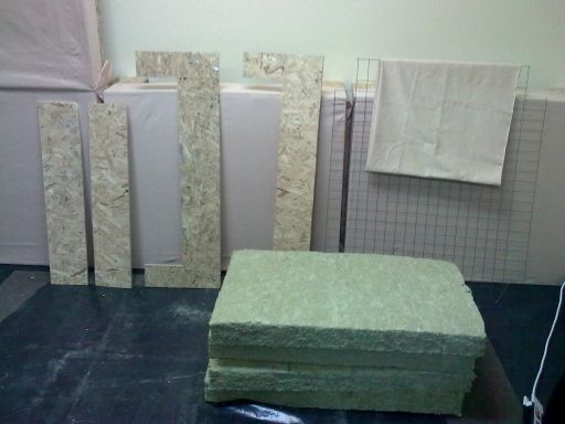 Recept: za panel debljine 20 cm (sa graničnicima od 20cm za odvajanje od zida) veličine 120cm*100cm, potrebno je 1. jedna trećina (80cm) OSB ploče debljine 1.5 cm, 122*244 cm, ima je na svakom stovari?tu i ko?taju oko 600din po m2. 2. dve trećine bale kamene vune SK, 40kg/m3, debljina 10cm, 6 komada 60cm*100cm u svakoj bali, cena oko 450din/m2, odnosno oko 1600din po bali. Nije lako naći ba? ovu na stovari?tu, ali mo?e se upotrebiti i neka druga. Konkretno, ovo sam uzeo u "Partizanu" na putu za ?eleznik. 3. ?ičana mre?a 1m*2m, koristi se za armaturu za betonske ko?uljice, a u ovom slučaju kao leđa panela, oko 180 din. Ima po stovari?tima. 4. tkanina iz 'metar na kilo', ima vi?e varijanti, ja sam uzeo neku koja je 900 din/kg, ?to je oko 150*280cm po kg, dovoljno za dva panela. 5. ekseri :) Cena po panelu ispadne oko 2200 din. Ja sam napravio 9 komada i ukupno potro?io oko 20,000 da pokrijem ceo zid 4m*3m, izađe oko 1,600 din/m2 Sledi obja?njenje sa slikama. |