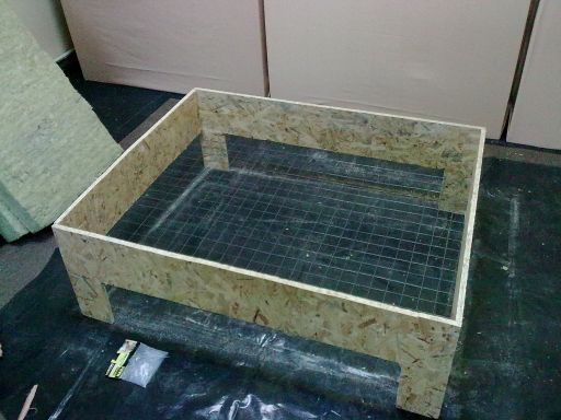 3. ?ica se po skrati skrati tako da bude 120*100 i iseče se par kockica na uglu da mo?e taman da legne na leđa, a zatim se ekserima koji se ukucaju do pola i onda iskrive preko ?ice pričvrsti za ram. Ram time dobija ne samo leđa već i rigidnost da pravi uglovi ostanu pravi. Na slici je već sve prikucano i okrenuto na drugu stranu, spremno za punjenje kamenom vunom.