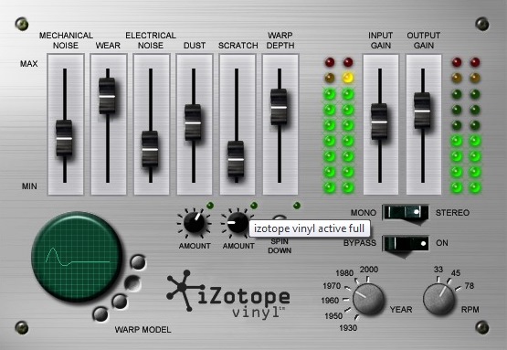 iZotope Vinyl is a plug-in that lets you simulate the dust, scratches, and warp of a worn record and the electrical and mechanical noise of the turntable it’s on.