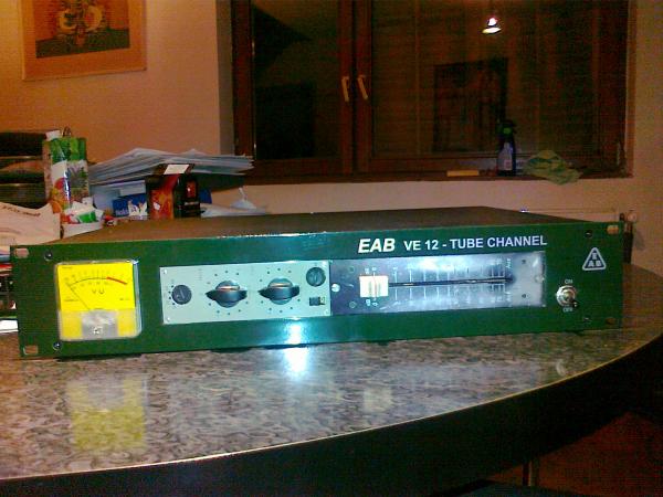 Pa covek koji mi je to rackirao je imao jedan veliki retro VU ali meni se ovaj vise dopao. Iskreno ne znam tacno koje su lampe, samo znam da su iz 60- ih godina, da su long life, to mi je rekao i covek koji je odrzavao taj mixer. A ceo uredjaj se sastoji od modula V12 koji ima ulazni deo sa jednom lampom (vidi se na slici) i passive eq koji isto ima jednu lampu (mislim da su identicne), naravno sa ulaznim trafom ( zaliven je). E sad out uredjaja je posebna prica, stavili smo ceo out iz Studera C 37 sa izlaznim trafoom, da bi dobili balansirani Out, mislim da je taj out neverovatno cist i on mu daje izlazni nivo od +4dB (C 37 je legendarni magnetofon za upucene). Imali smo mogucnost da stavimo i originalni EAB out modul ali hteli smo ovo jer smo predpostavili da i taj izlazni trafo utice na sound i nismo se prevarili.